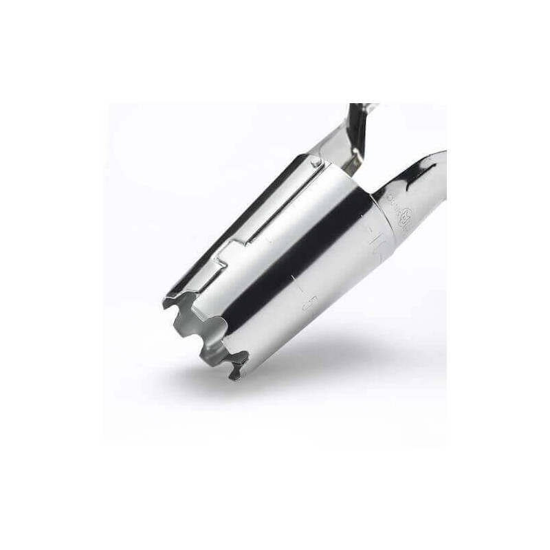 Dispone de ocho dientes de acero que facilitan la penetración en la tierra y el botón pulsador en su puño. Graduación exterior de 5 a 10 cm